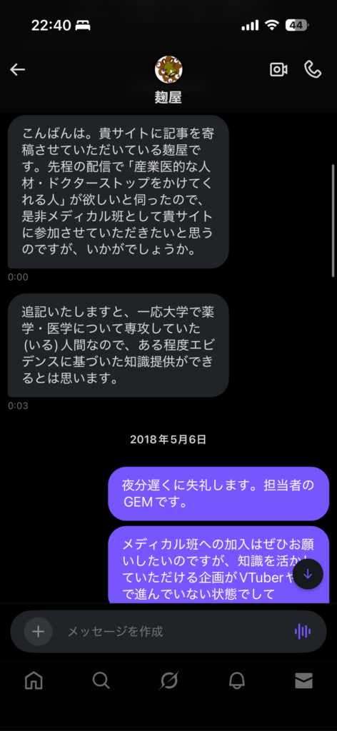 アプデはかせ基本的にAPPDATEの連中はふざけた話しかしてないのですが、生命を預かることの重さを知っているメディカル班と、APPDATEの良心である私だけが誠実な会話をしていました。